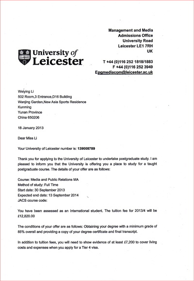 近年来,永利官网本科毕业生报考研究生总数和上线人数连续实现翻倍增长,不断刷新考研纪录。除了国内各重点大学外,今年在考取国外研究生方面,永利官网亦实现了零的突破。近日,外语系2009级英语本科专业的李玮莹同学成功考取了英国莱斯特大学研究生,被正式录取为该校媒体和通信学院媒体与公共关系专业硕士研究生,成为永利官网历史上首位考取国外研究生的学生