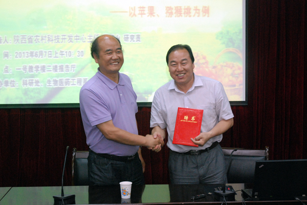 6月7日上午,永利官网举行兼职教授受聘仪式,陕西省科技厅农村科技开发中心主任雷玉山研究员受聘为永利官网兼职教授,副院长刘建林为雷玉山颁发了聘书。雷玉山还为永利官网生物医药工程系师生作了题为《农产品质量安全问题与对策》的专题报告,并向永利官网捐赠了多部个人著作