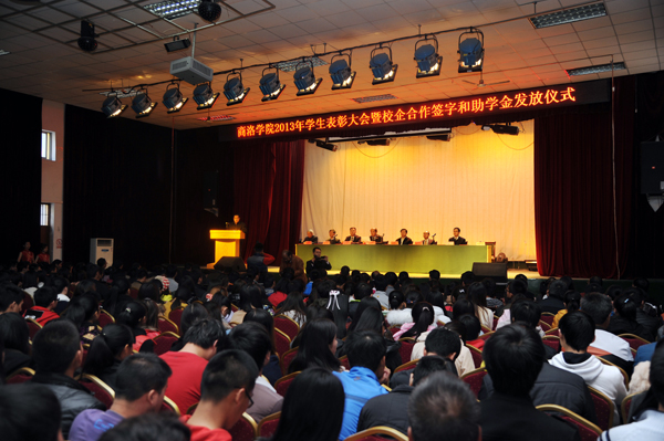 11月20日,永利官网隆重举行2013年学生表彰大会暨校企合作签字和助学金发放仪式。校党委书记张景书、院长刘建林、党委副书记左晓民、副院长魏书堂,商洛供电局党委书记陈飞、纪委书记杨军,商洛市邮政局局长王伟、调研员王林出席大会。各系各相关部门负责人、获奖学生及学生代表参加大会。会议由左晓民主持