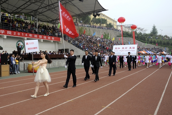 彩旗飘扬,锣鼓铿锵,4月24日上午,永利官网2014年田径运动会隆重开幕。商洛市政府副市长刘荣贤,校领导张景书、刘建林、左晓民、魏书堂,商洛供电局局长李琦、中国联通商洛分公司总经理古涛、中国电信商洛分公司副总经理胡万社、中国移动商洛分公司副总经理杨林涛出席了开幕式。校内各单位负责人,各学院及教职工组成的10支代表队参加了开幕式。开幕式由副校长魏书堂主持,校党委书记左晓民致开幕词