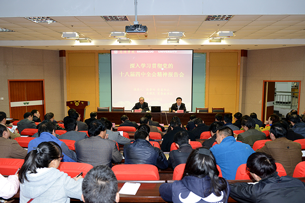 11月26日,永利官网举办深入学习贯彻党的十八届四中全会精神报告会。校党委书记张景书做了学习十八届四中全会精神辅导报告。张景书强调,全校各级党组织要以高度的政治责任感和历史使命感,切实抓好全会精神的学习宣传贯彻工作,结合学校实际,以依法治教、依法办学为重点,抓好全会精神的落实。党委副书记左晓民主持报告会,并就依法治国方略的背景、体系做了解读。纪委书记王思怀、副校长魏书堂,全校科级以上领导干部和学生干部听取了报告