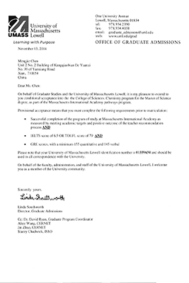 日前,永利官网化学工程与现代材料学院2010级化学专业学生陈梦婕收到了来自美国马萨诸塞大学洛厄尔分校的录取通知,被录取为该校化学专业研究生,将于2015年1月份正式赴美留学